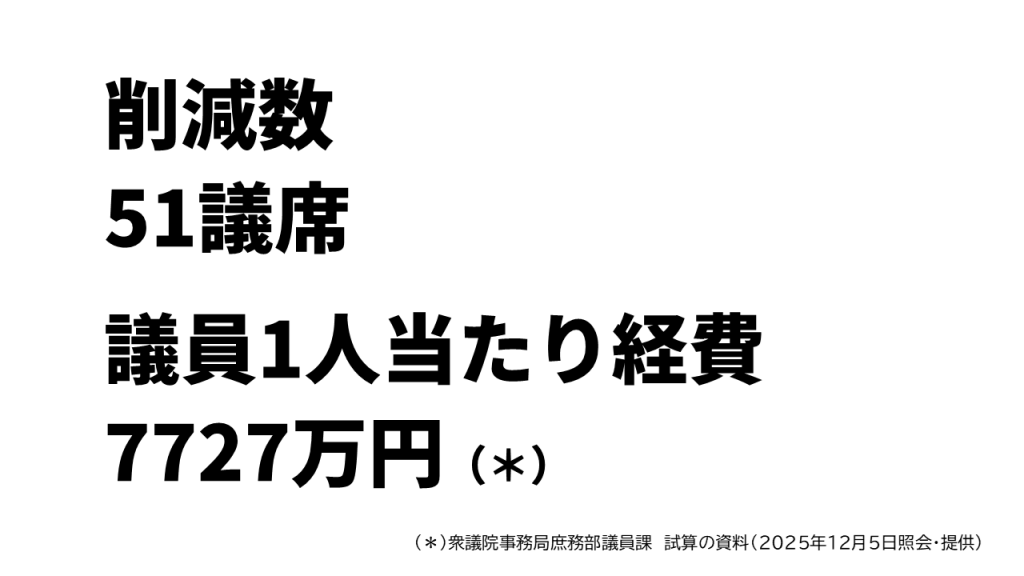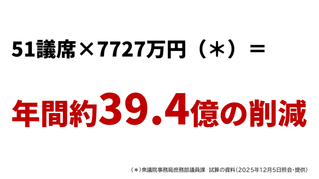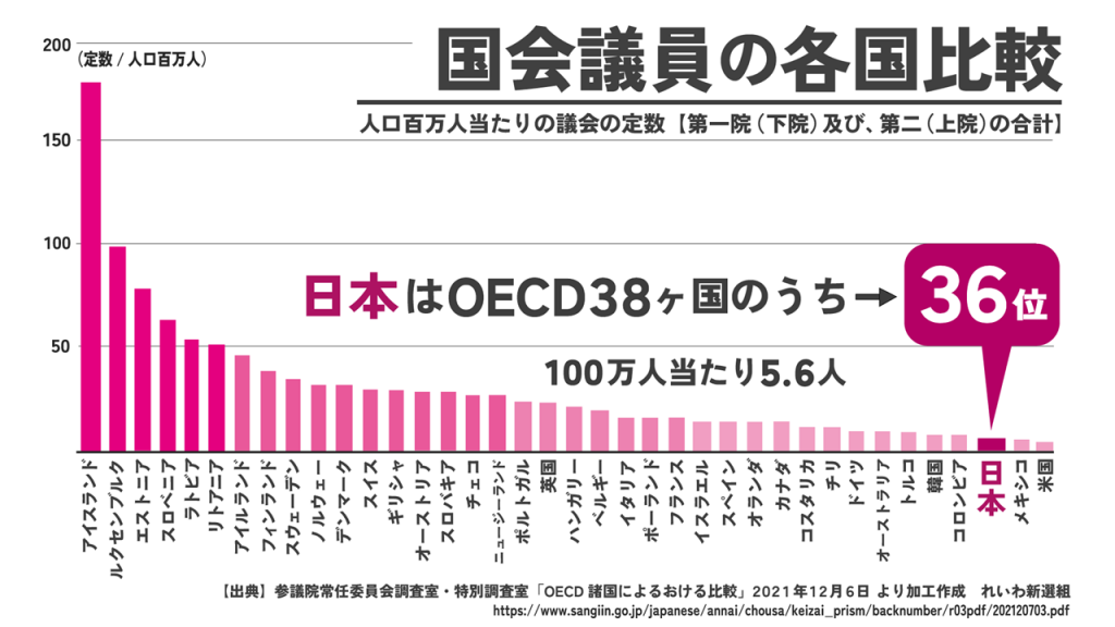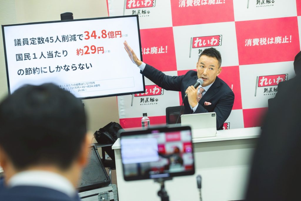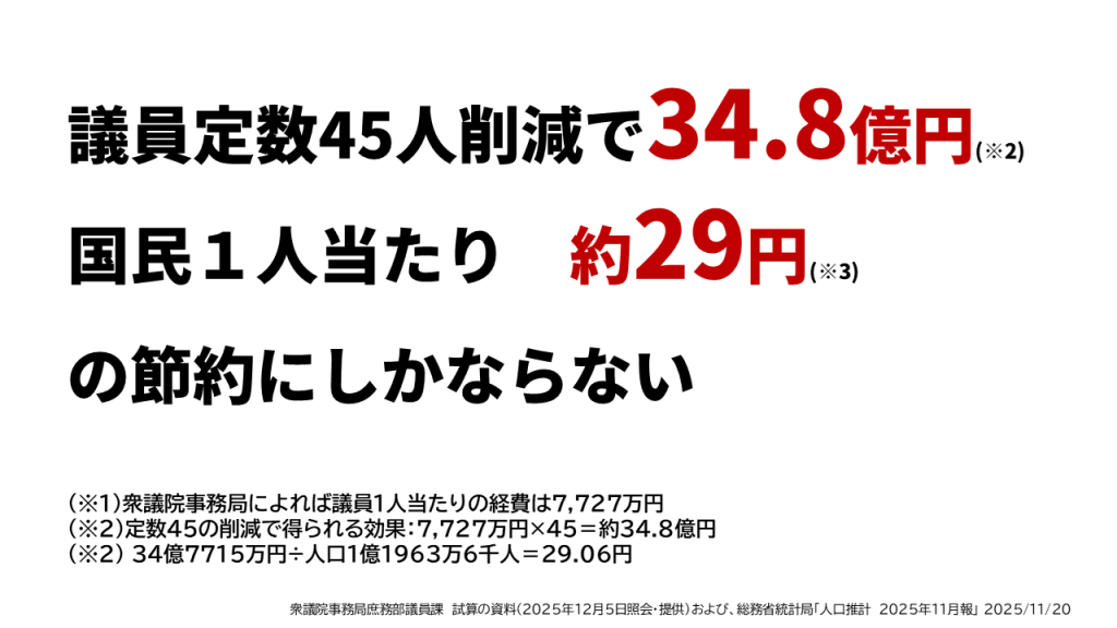 京都人かと思うた、ほんま。ありがとうございます。定数削減のことについてもお聞きいただきましたけども、NHKさん、これは東京新聞さんからの質問なので、それに対する回答は盗まないでください。さっき、NHK用に答えましたので。お願いしますね、本当に。はい。というわけで、結局、センターピンだっつったってずれたものにセンターピンを置いてるんですよね、いつも。結局、社会保障っていうものの改革をやっていくっつったって、それ高齢者殺す話ですから、彼らが言ってるのはいつも。で、そのセンターピンさえもずらして。で、彼らは選挙のときにも消費税の減税。これは私たちとは違う内容だけれども減税ってものを言ってたってことです。で、高市政権と1つになる前には、このいろんなことを結んでいく前ですね、合意する前までは当然、この消費税に関してもこれ合意の中に入れるという趣旨のことを言い続けてきたわけですよ、言ってたわけですよ。でもフタ開けてみたら全然関係ないことを、その合意の中でしてるわけですね。その中の1つが定数削減です。どうして定数削減が必要ですか?ってことです。考えてみたら定数削減する必要ないんですよ。だって、あの先進国で見てみても100万人当たりの国会議員の数は日本は少ないグループなんですから。ね、この通りですよ。OECD38カ国中36位です。100万人当たり5. 6人しかいないっていう。