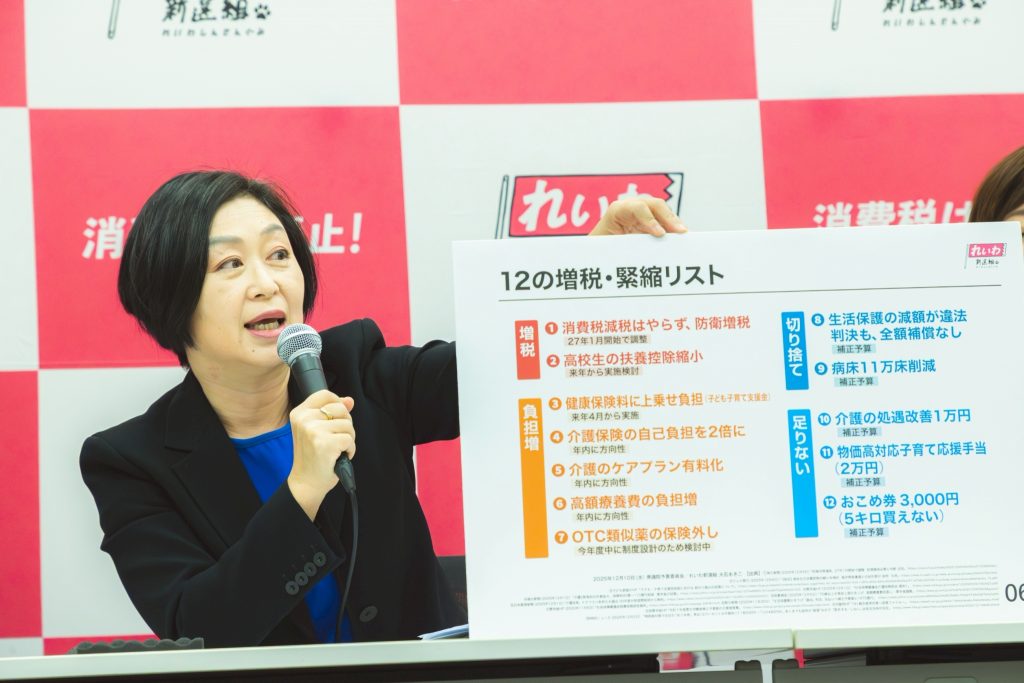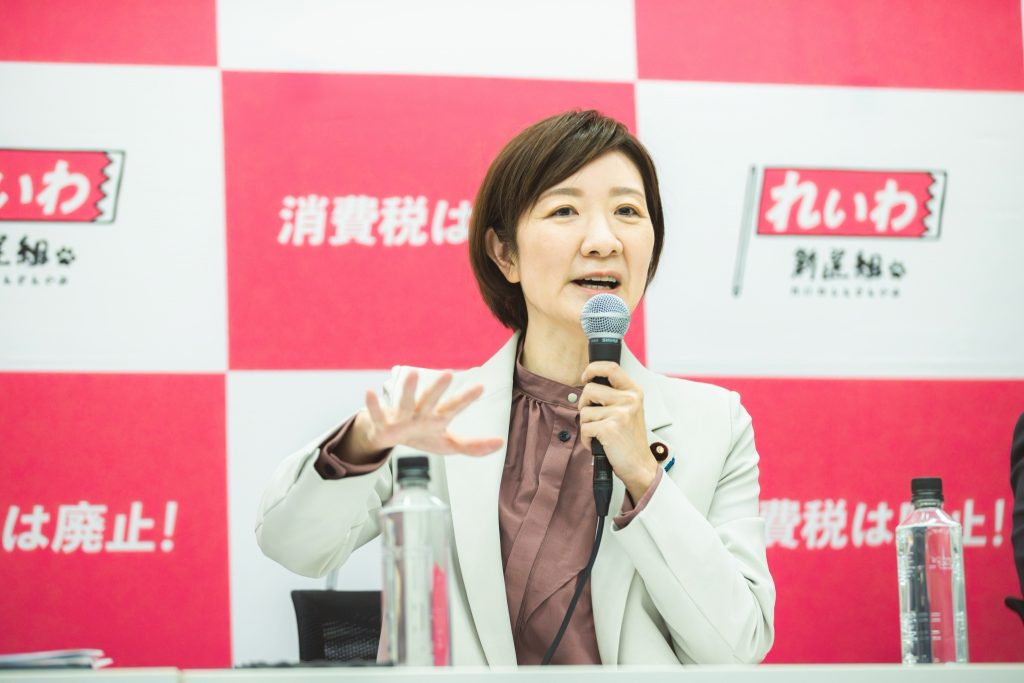 共同代表のくしぶち万里です。ご質問ありがとうございます。高市政権の女性政策の話の前に、原発再稼働の話があったので私からも一言補足させてください。電気代が高い、再エネ賦課金が上乗せになってるからやめろみたいな再エネバッシングっていうのがあるんですけども、そもそも原発再稼働したら電気代安くなるんですか? 私は大変疑問です。そもそもですね、今の電気代にも原発事故の被災者への賠償金は上乗せされてますね。再エネの賦課金だけではありません。そして立地自治体への電源三法交付金とか、国からの補助金で原発は稼働しているわけですから、新増設も含めて再稼働というのはれいわ新選組は反対です。そもそも新増設なんて私はもってのほかだと思ってまして、リスクにおいても、スピードにおいても、コストにおいても全く非現実的ですね。ですから安全保障の話が今、かまびすしい、要は周辺の地域の安全保障環境が厳しくなってるなってるって盛んに防衛費増やしてるわけですけれども。原発を再稼働させて50基以上も日本列島狭いところに維持していること自体がそもそもリスクじゃないですか。ですから原発はすぐにでも止めて、再稼働や新増設っていうことは絶対にやってはいけないと思っています。電気代は安くなりません。そして女性政策ですけれども、そもそも働いても、働いて働いて働いて5回ですか、流行語大賞になったの私、どうかしてると思います、この日本。もう民間の方々含めて、あれが流行語大賞になるようなこの世の中自体がおかしいというのと(あとパネルお願いしてもいいですか)、そもそも女性政策ストレートだけではなくてですね、そもそも基本的に子育てとか介護とか、それが家事も含めて女性が担っている状況をどう底上げしていけるような政策が高市政権にあるのかといったら全くないわけですよ。