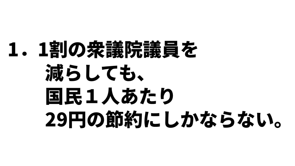 これを考えたときに、やっぱり民意の反映っていうものが、より難しくなるのが、これ定数削減であるっていうのは、もうこれは私が言うまでもないっていうことだとは思うんですけれども。まぁ、過去にも定数削減はやっていますと。1986年が一番、国会議員の数が多かった。そこから51議席を削ってるわけですよ、今に至るまでの間に。この51議席削られたことによって世の中は良くなりましたかっつったら、良くなってないんですよ。悪くしかなってないんです。で、ここに関してのコストをとにかく削れっていうような話もあります。じゃあ、削ったらいくらになるんですか?ってことなんですけれども、例えばですけど、これは51議席で考えたら39. 4億円削減されますと。で、年間、国民1人当たりで33円キャッシュバックみたいな話になるんすよ。33円のキャッシュバックごときで、人々の声が届かないような社会にさらになっていくっていうのはこれ悲劇でしかありませんね。一方で維新の案というところに関しては、これ45人削減っつってますからさらに29円のキャッシュバックでございます。しかもこれ、キャッシュバックされるのかどうかもわかんないしね。国家の経済っていうか、国家の経済規模、国家規模で考えたときに34. 8億円というのはそんなに莫大な金額ではありません。逆に言えば、人々の声をしっかりと聞き、それを政策として前に進めていくとか国会の中で議論をしていくっていう代理人。そこにかかる経費が34. 8億円であるならば、その価値は十分にあると私は思ってるんです。逆に言ったら仕事をしない国会議員というものを、その数のせいにされてしまっているっていうような、こういう話のすり替えみたいなものが一番ヤバいってことですね。仕事をしない国会議員、どうして生まれるんでしょうか?っていう本質に目を向けていただきたいということです。仕事をしない国会議員が生まれる理由は、仕事をしない国会議員を国民が選んでるからですってことです。役に立たない国会議員を国会に送り込むということをやめれば、その問題は改善されるってことですね。