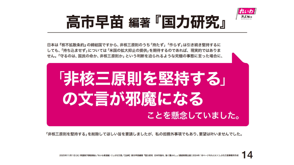非核三原則の話も同じで、その非核三原則、国是ですと言ってきました。で、しかし私も予算委員会のときに、高市さんが議員のときですね、総理になる前に自分の著書で非核三原則を堅持するということはその文言が邪魔になるから安保3文書を見直すっていうようなことを本に書いてたので質問したところ、見直しについては指示をしたっていうことを予算委員会では言いながら、しかし一方で党首会談のときには明示的に見直しは指示してないと二枚舌使っていたりですね、現段階では非核三原則を守ると私には答弁しているけれども、党首会談のときには現段階という言葉は使ってないとか。一体どっちなんだ?っていう話なんですよ。