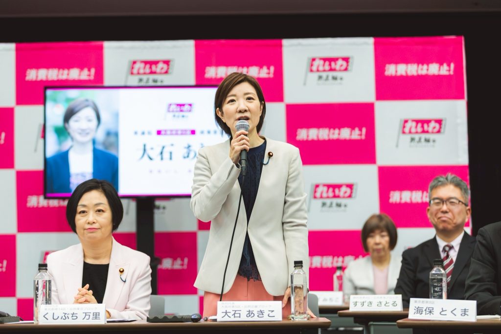 ありがとうございます。共同代表大石あきこです。そうですね、先日、勝手に杉田水脈さんが降り立ってきたのでどのような選挙戦を描くかというのは、それ以降のことになりますが。そうですね。先ほど、きっついオバハン対決と言いましたが、結果としてそうならざるを得ないわけですね。やはり、大阪5区の中で一番そうですね、自民党としては杉田水脈さん、この方、ちなみに元維新ですので『維新ぎらい』の範疇にも入るわけですけれども。それから維新の梅村(みずほ)さんという方。この方は元々民主党だったんですけれども、大阪で民主党から維新にガラッと票が奪われたときに民主党を落選されて、その後、維新の軍門に下って、都構想反対してたのに都構想賛成になったというような人物なんですけれども。そういった自民と維新の人物というのは、入れ替わり立ち替わり、自分のバッジが欲しい、それにふさわしいところに行くっていう方が多いと思いますが、まさに大阪5区でもそういう状況ですので。それで良いんですか? 皆さんと。有権者の皆さん、バッジが欲しい人たちが公約に掲げているのが議員定数削減。削減を食らうのはこういった嘘を追及している少数政党だったりするわけですよね。れいわ新選組は、先日、山本太郎代表が議員辞職したり、または今日ここに来ている人たちも本当に普通の生活者ですよね。普通の生活者が、国会って本当、立派なところ、貴族の住むところですから、一言で言ったらみすぼらしいものですよ、私たちは。はい。普通ですから。でも、それが私は誇らしいと思っています。だから嘘をつかない。国会の中で良い服も別に着ていない。普通の庶民でみすぼらしいかもしれない、だけれどもそれが誇らしい。皆さんはどっちを選びますか?ということを正々堂々と聞いていきたいと思います。ありがとうございます。
