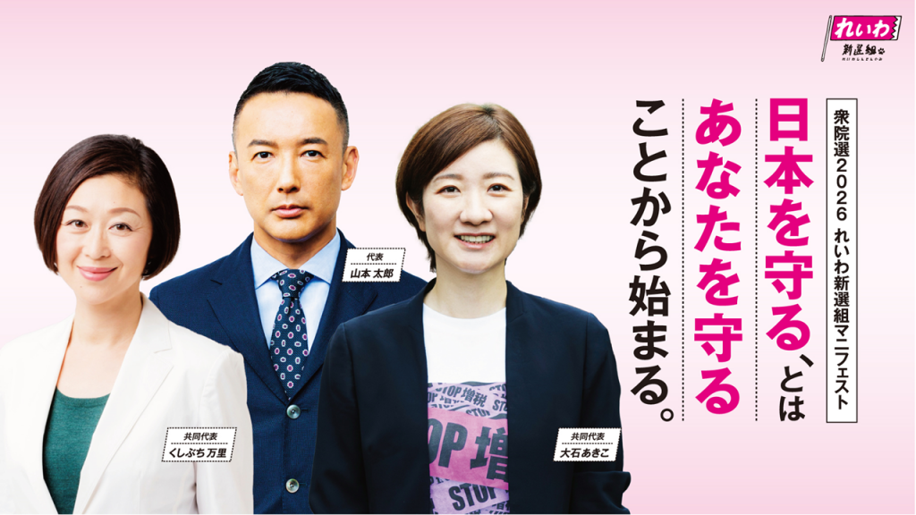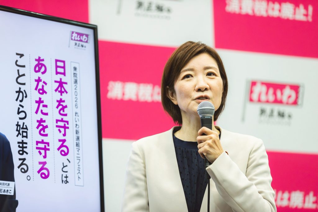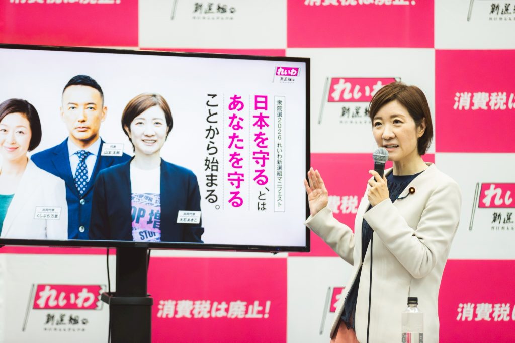 皆さま、お集まりいただきましてありがとうございます。ただ今より、れいわ新選組の衆院選2026マニフェスト発表会見を行います。私、れいわ新選組共同代表、また政審会長の大石あきこです。政策審議会長です。また視聴してくださっている皆さん、ありがとうございます。れいわ新選組のマニフェスト、WEBサイトでも特設サイトがそろそろリリースされます。「そろそろ」で申し訳ないんですけど、15分以内くらいと聞いてます。配信をご覧になっている中でそちらのほうからご覧いただけるほうが便利かもしれません。ご覧ください。ということで、記者の皆さまには、紙で衆院選2026 れいわ新選組マニフェストをお配りしているかと思います。その紙面とも整合した内容で発表したいと思います。ということでスライド。そうですね、参ります。