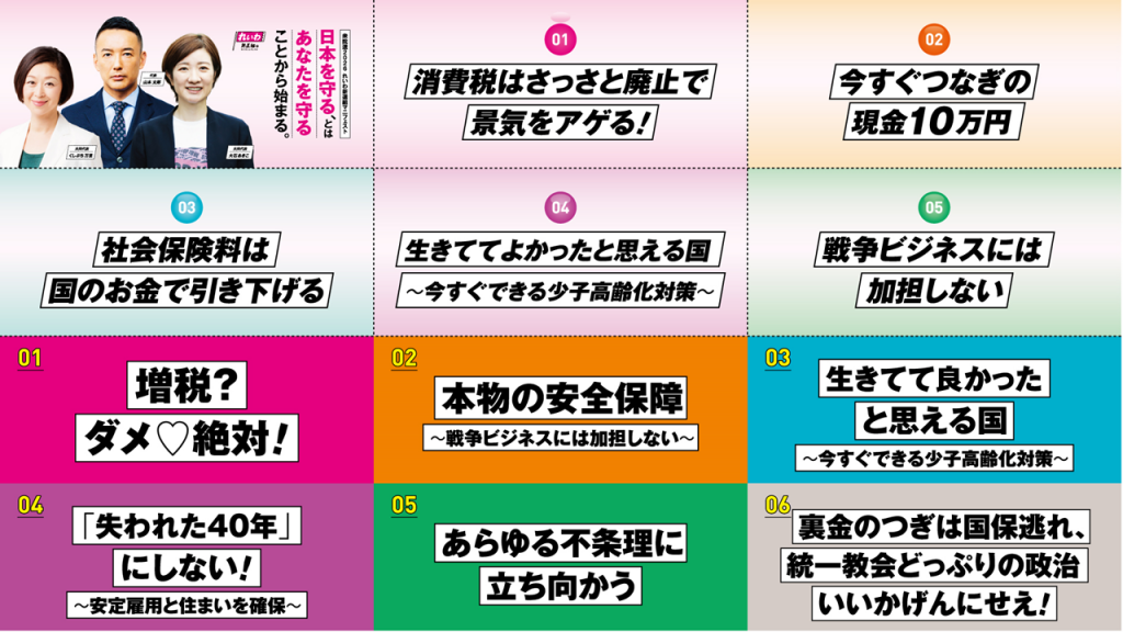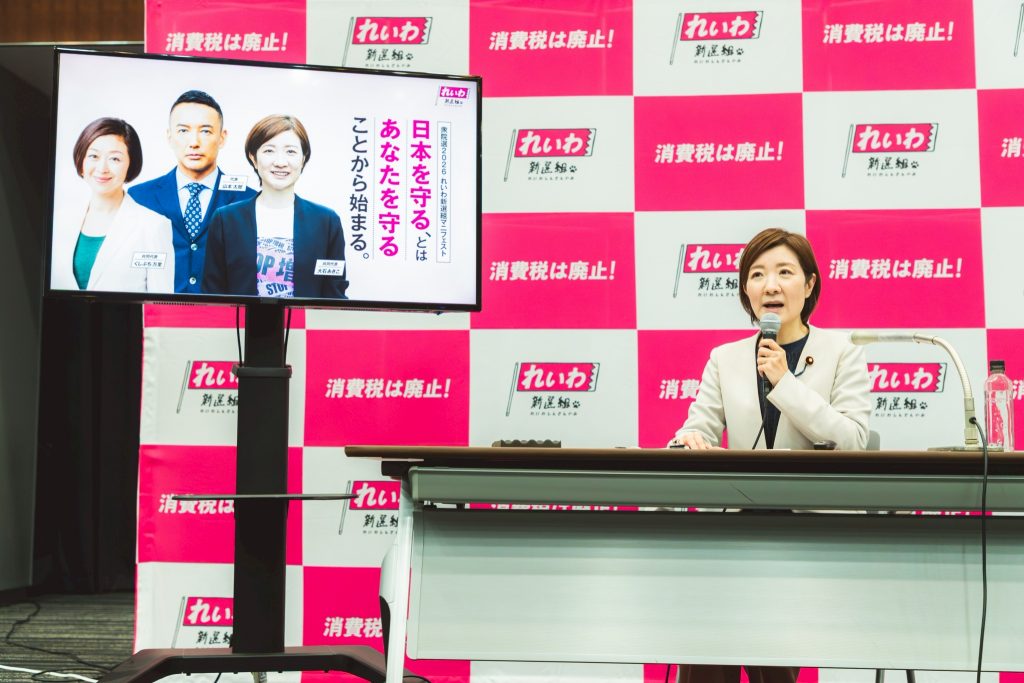 (あ、わかりました。最後、幹事長で。ちょっと待ってくださいね。そうすると最後、このマニフェストでですね、2ページ目のスライド、一覧、もう一回見せてもらっていいですか)はい。今日はこの5項目、れいわ新選組の掲げる5項目プラス6項目の中でも、5つの項目を主に中心にして記者の皆さまにもご質問をいただきました。それ以外でもたくさんのマニフェストの中身、掲げております、元々掲げているものですけれども、「増税?ダメ♡絶対!」という項目の中に、消費税廃止を含めていろいろな、どんな増税がダメなのかなどが書いてあったりとか、「本物の安全保障 〜戦争ビジネスには加担しない〜」以外の部分でも、防災だったり、必要なものごと、トランプ関税についても書いています。トランプ関税の影響で世の中で円安をすごく問題にされるきらいがあるんですけれども。今、確かに行き過ぎた円安ではあるんですが、それを是正するならば、やはり対米投資80兆円相当、5500億ドルの投資というのはやってはいけないですとか、さまざまな処方箋、物価高に対応するんなら消費税廃止だとか、さまざまな処方箋を書いております。「生きててよかった」は、これは同じですね。「「失われた40年」にしない!」ということで。私も48歳、ロストジェネレーションなんですけれども。ロストジェネレーションと呼ばれる世代の方2000万人いらっしゃいますが、そこで望まない不安定雇用だったり、失職、失業されてる方も少なくないので、そこを取り戻していく。「〜安定した雇用と住まいを確保〜」しよう、そういったメニューも政策も用意しております。「あらゆる不条理に立ち向かう」。これも今日、候補予定者の発表の中で申し上げました。私、大阪5区で立候補する予定なんですけれども、私の候補、大阪5区にですね、自民の杉田水脈さんが立候補するんですね。この方、裏金議員なんですけれども。裏金だけではなくて、少数民族の方々に差別的言動というのを繰り返したりして、人権侵犯2回認定されてるんですね。北海道と大阪の法務局でですけれども。なのにそのこと追及されても、「いや、私は人権侵犯の認定を受けてません」とか、「いや、受けてるじゃないですか」みたいな。平気で嘘をついたりとか、平気で弱い立場の人を傷つけたりとか、そういう自民党の元議員をまだ性懲りもなく、しかも裏金議員を立候補させる。34人の裏金関係者が今回、立候補するんだと言われていますよね。こちら裏金なんですけれども、「あらゆる不条理に立ち向かう」っていうのは、そういう政治潮流とは一線を画します。すべての、この国に生きるすべての人々に尊厳があるんです。だから、「あらゆる不条理に立ち向かう」。人の尊厳を奪うような行為許さない、差別を許さない、そういったことなどなどが書いてあります。または憲法ですね。憲法を変えさせようとしている。高市総理が改憲を狙っていて、よりにもよって緊急事態条項という内閣の独裁。法律を国会で審議しなくても法律と同じ強さ、権限を持つような政令をつくれるという緊急事態条項を本格的につくるということで、憲法起草委員会を立ち上げるなどを進めているんですね。こういったことを絶対許しちゃいけないんだということもここで主張しております。「裏金のつぎは国保逃れ、統一教会どっぷりの政治いいかげんにせえ!」ということで。すべてを貫くものですけれども、やはりこの嘘だらけの政治。国会の貴族による嘘だらけの政治。こういったものと決別するためには、それを徹底的に暴き、接近戦でデッドボールを食らわしていくという集団が必ず必要なんです。そういう集団が全くほぼなくなってしまったんですね。中道っていうのがつくられたことによって、ますます野党というのがなくなっていく。実質的に大政翼賛会化していくでしょう。そういう国会の中で、やはり突破できるとしたら、れいわ新選組だと思います。ということで、このマニフェスト、もう特設ホームページにアップされておりますので、視聴者の皆さんも、記者の皆さんも、引き続きホームページでもご覧いただけたらと思います。ありがとうございます。では、高井幹事長から。はい。