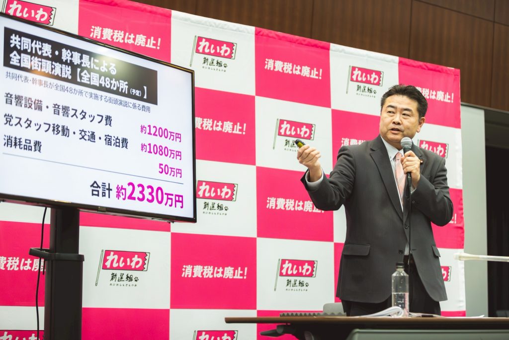 はい。衆議院選挙の寄附目標額4.4億円。そんなにかと思われるかもしれませんが、ちょっと具体的にご説明させていただきます。エントリー費用。これは供託金と、それから基本的な活動費です。今回、31名ですね。小選挙区と比例単独でこうなります。小選挙区はですね、供託金は300万、それから比例代表300万。重複すると600万。これだけで31人で1億6800万円が必要になります。それから基本活動費。これ候補者に公認料としてお支払いしているものですが300万円。これ敷金・礼金、事務所の家賃とか看板とかこういったもの。ちなみにですね、これ私、以前、立憲民主党とかにいましたけど、他の政党は大体1000万出ます。1000万〜1500万出ます。れいわは300万で、本当に候補者の皆さん申し訳ありません。それでも9300万円かかります。ということで、この供託金と基本活動費、公認料で合わせて2億5800万円必要になります。31人擁立する最低限の費用は2億5800万円。これ最低限かかるお金です。で、まだまだかかるということで、少しご説明させていただきます。党本部自体で選挙をやるために最低限かかる費用というのをご紹介します。まず、ボランティアセンターというのをいつも置いてます。これが800万円。電話回線、それから事務所費、合わせると大体約1000万円弱かかります。それから街宣車1台90万円。運転手、ウグイス、アナウンサーですね、これで大体2000万円ちょっとかかります。それから、今回、代表が回りませんが共同代表と幹事長で手分けをして全国48カ所を回る予定です。これは候補者が立たないところにも行きます。都道府県を回りますとですね、その地元のマスメディアが共同代表、幹事長であればですね、取材していただけるということで、そのための費用がこのように2300万円かかります。で、ここまで擁立だけでかかる費用と最低限の選挙費用で3億1162万円ということになります。