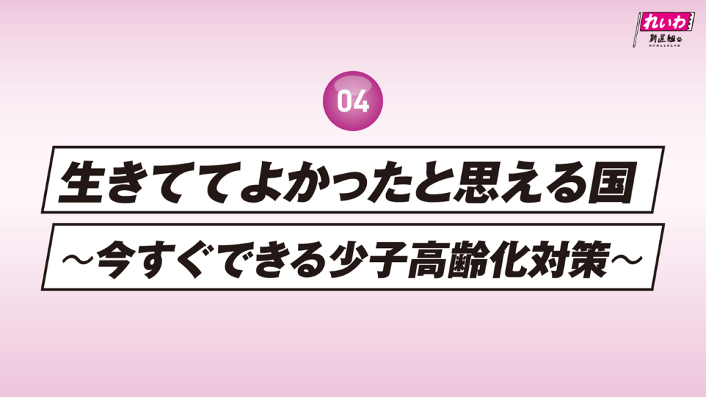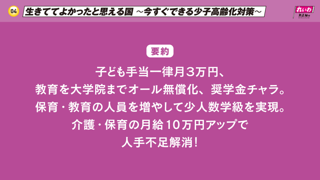 次の4つ目のテーマに参ります。「生きててよかったと思える国 〜今すぐできる少子高齢化対策〜」。要約してお伝えいたしますと、「子ども手当一律月3万円、教育を大学院までオール無償化、奨学金チャラ。保育・教育の人員を増やして少人数学級を実現。介護・保育の月給10万円アップで人手不足解消!」。これを訴えて参ります。