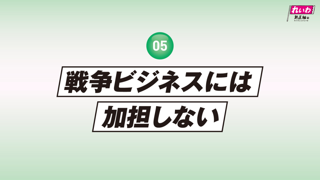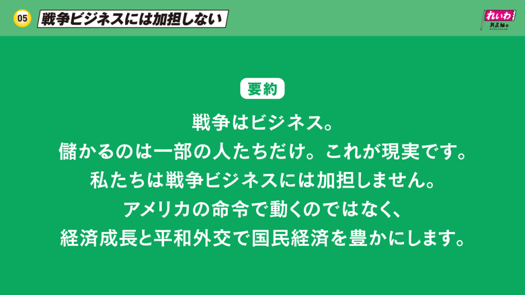 そして5つ目です。「戦争ビジネスには加担しない」。これも1つ大きな選挙の争点に今回なると考えております。要約してお伝えしますと、「戦争はビジネス。儲かるのは一部の人たちだけ。これが現実です。私たちは戦争ビジネスには加担しません。アメリカの命令で動くのではなく、経済成長と平和外交で国民経済を豊かにいたします。」。これを訴えて参ります。