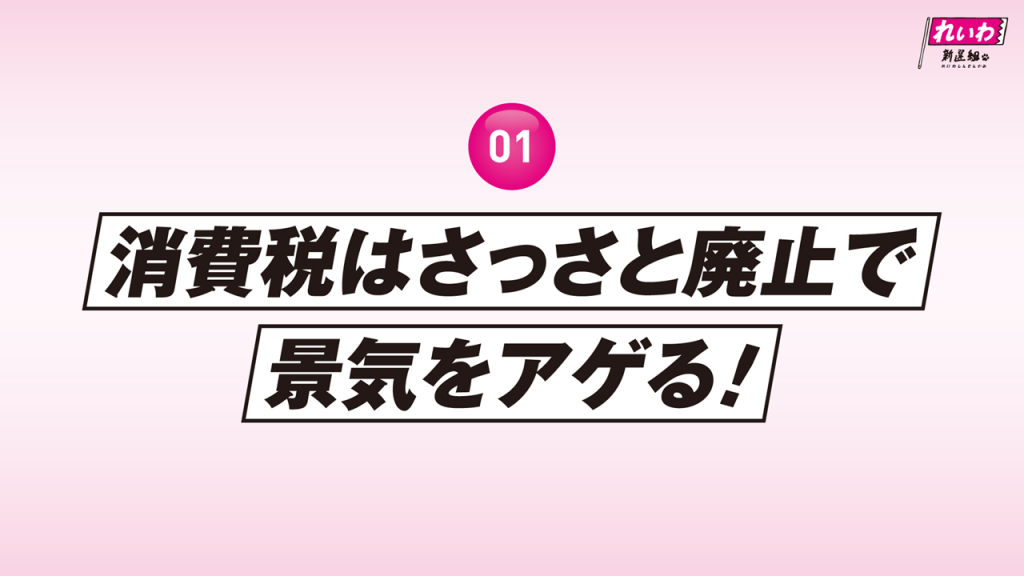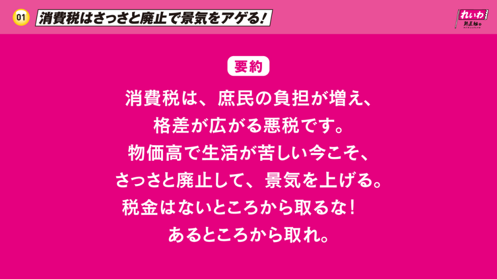 それでは始めます。5つある、メインで打ち出す5つと言ってる1つ目のほうですね。「消費税はさっさと廃止で景気をアゲる!」。こちらです。要約してお伝えいたしますと、「消費税は、庶民の負担が増え、格差が広がる悪税です。物価高で生活が苦しい今こそ、さっさと廃止して、景気を上げる。税金はないところから取るな! あるところから取れ。」。これを訴えて参ります。