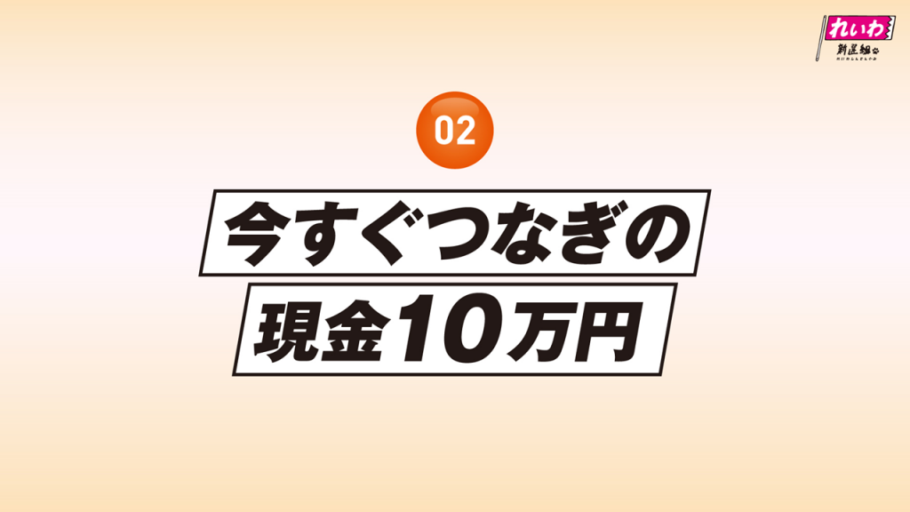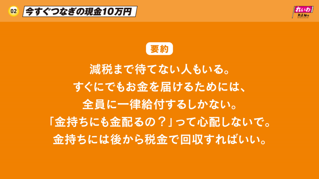 そして次ですね、次のテーマに行きます。2つ目です。「今すぐつなぎの現金10万円」。要約してお伝えしますと、私たちは減税、消費税廃止を始めとして減税を掲げています。他の政党も減税を選挙の公約では掲げたりもいたします。一方で減税まで待てない方もいらっしゃいます。すぐにでもお金を届けるためには、全員に一律給付するしかない。「金持ちにも金配るの?」心配しないでください。お金持ちには後から税金で回収すればいいんです。