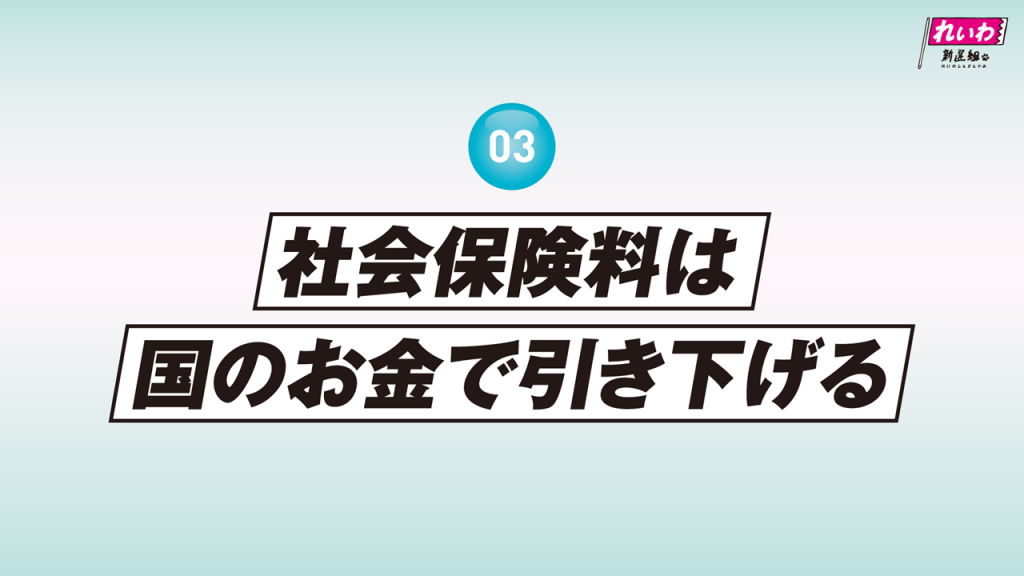 次の3つ目のテーマに行きます。「社会保険料は国のお金で引き下げる」。要約してお伝えしますと、今、ずっとこういう流れになってますよね。社会保険料を引き下げると言ってどういうことになってるか? がん患者や高齢者に負担を押し付ける議論ばかりしています。しかし、「がん患者や高齢者などに負担を押し付けても、「現役世代の負担」は減りません。医療や介護こそ成長産業。国のお金を入れて、社会保険料は引き下げる」。これを訴えて参ります。