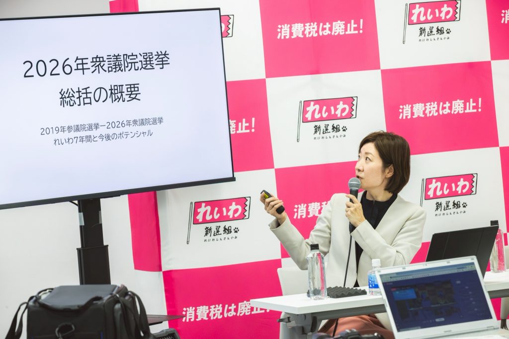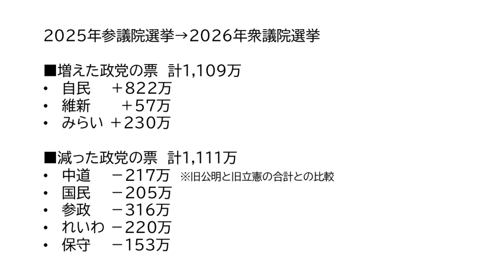 今回、資料をちょっと使いたいと思いますが。選挙総括。ある程度、数字でやっていきたいと思います。「2026年衆議院選挙 総括の概要」ということで、れいわの7年間の選挙の票の動き、れいわの7年間と今後のポテンシャルというところで、大きな、今回のれいわも含めた票の動きがどうであったのかっていうことを、簡単に振り返りたいと思います。参議院選挙が去年、半年前にありまして、で、今回の衆議院選挙で全体として増えた政党はどうであったか、減った政党はどうであったかっていう分析。そしてその方々が訴える積極財政というのは全くそうではない、などのことをご説明したいと思うんですけども。まず、今回の選挙全体として得票数が増えた政党、その得票が1100万票なんですね。で、それの圧倒的多数、その8割くらいを自民が増やしてて、維新は現状維持か、ちょっと増やしてて。で、みらいという政党が新たに、みらいとしては大きく増やしたという票の流れになっています。じゃあ一体、この1100万票がどこから吸い取られたのかっていう中にれいわ新選組も入ってるわけですけれども。中道という政党、これは公明党と立憲の足し合わせた政党ですので、足し合わせた前回の参議院選挙からすると217万票も票を失っている。で、国民民主党も205万票を失っている。参政党316万票を失い、れいわは220万票を失い、保守党が153万票を失って。この失われた票が大きく8割以上自民党に分配されるということになったっていう中で、れいわ新選組の票もどこから来たのかっていうのは、詳細分析っていうのはもっとこれからしていく必要がありますが。この1000万の大流動の中で大きく自民に、これまで積極財政を、ほぼ積極財政と言えばれいわ、消費税減税廃止と言えばれいわという立ち位置だったものが、高市政権が積極財政という言葉は発するようになり、そして減税しないのに消費税減税を語るようになるという結果として、やはり政権、政権が減税を言うんだからすぐに、今すぐ生活が苦しいという中で期待が高まるという状況で、大きく自民に票が流れたと考えられます。そもそも流れたって言ってるけど、1票1票、顔のあるといいますか、有権者の票なんですよね。