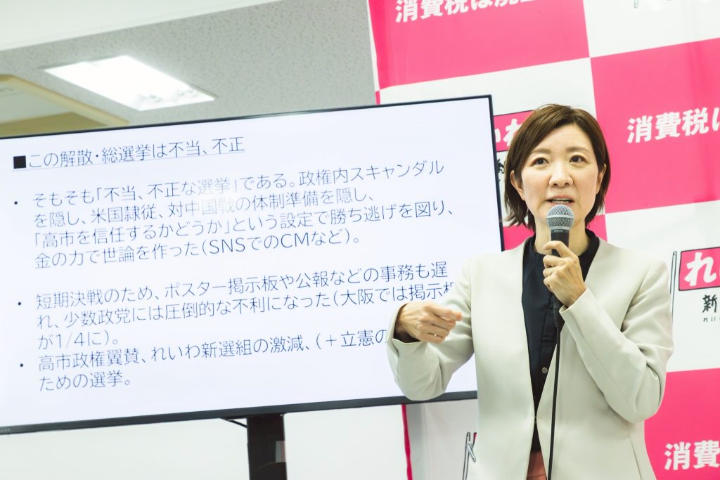 そもそも不当不正な選挙で政権内スキャンダルを隠したわけじゃないですか。統一教会と関係のあるかもしれない人が総理でいいですか? 説明はしませんけれども、早苗が総理大臣でいいかどうか選挙とかあり得ないでしょ。討論会の別枠でも取って、総理呼び出して2時間でもかけて統一教会の文書の32回高市早苗って出てきたの何?っていう番組が組まれなきゃいけないでしょ。なぜ総理に解散権があるね、やるのかやらないのみたいな話で、そういう選挙になっちゃうんですか。だからそもそもこんなもん、不当不正に決まってるんですよ。でね、アメリカに隷従して対中国戦の体制準備隠してるじゃないですか。多少の報道はなされましたよ。高市政権の公約。憲法、緊急事態条項を入れようとしてる。スパイ防止法、アメリカのCIAの日本版ですよね。通信を傍受させていくとか。それって、こういう、私やれいわのような、政権がこんなことやろうとしてるやろみたいな都合の悪いことを言う者たちからまずこれスパイとしてしょっぴかれるじゃないですか。それがかつての治安維持法でしょ。かつての戦争でやられたこと、既にそれ始まってるんですよ。とか、アメリカに隷従して、トランプさんに高市政権支持するって、選挙の過程で言わすって、それ介入やって、ちょっとしか報道されてないでしょ。大問題ですよ、こんなの。選挙やってる場合かレベルの大問題ですよ。なのにこれが日常、平常心みたいな話になっちゃってるっていうこと自体がこの国が異常。だからそんなの、そんな総選挙自体、不当、不正に決まってるんです。全部明らかになってたら、「おいおい、こんな解散やらかして何考えてんだ」ですよ。解散なんかできませんよ。はい。で、金の力で世論つくってるわけじゃないですか。SNSでの。あり得ない1億回流れたCMとか。もう皆さんもご承知の通りですよね。そんなの検証しなきゃいけないんじゃないですか。それ、うちの党で検証するのは難しいですよ。自民党って、Dappiでも、Dappiっていう問題で既に裁判で負けてますよね。Dappiっていう、その時、Twitterの有名なアカウントの人が自民党からお金をもらってたのは事実。で、そこの社長、おそらく社長がって裁判でも言われてる、そこの社長が、資金もらってですよ。で、1日中、立憲とか共産党の悪口言いまくって、自民と維新を翼賛するようなツイートに明け暮れ、それで名誉毀損。裁判で名誉毀損が決まったんですよね。それってまだその話も済んでないし。だからそういうことが今まで行われてきたし、「今回だけはクリーンです」なわけないでしょうっていう。なので、一方でリアルの現場ではどうだったか? これ短期決戦やから雪国なんか選挙の体、成してないですよ。それも検証されたのか? こんなことが政権がやって許されたのか? 許されちゃってるのが不正なんですよ。で、私、大阪で出てましたんでね、大阪の事情で言えば掲示板4分の1。それで主権者にちゃんと選択権を与えたって言えます? 言えないんですよ。徹頭徹尾、高市政権翼賛だし、れいわ新選組の激減だし、こういうことをズバズバとズケズケと言うっていうことをテレビで当たり前にやったら、何かしら謎のバッシングを受けるとかね。口が悪い? 具体的に言ってみろよっていう。どれが口が悪かったんだよっていうね。私は特にテレビ討論ではかなり品位を保ってやっていましたから。都合の悪いことはズケズケ言ってましたよ。だけどテレビ討論においては、我ながらおとなしいなあレベルの、そんな悪口なんか一切言っていない。批判だって政策のことも言わなきゃいけないから時間を考えてやらなきゃいけないから、そんな批判なんかろくにもできてませんよ。その私が批判ばっかりと言われるとか、もうあり得ないんですよ。っていうような状況。