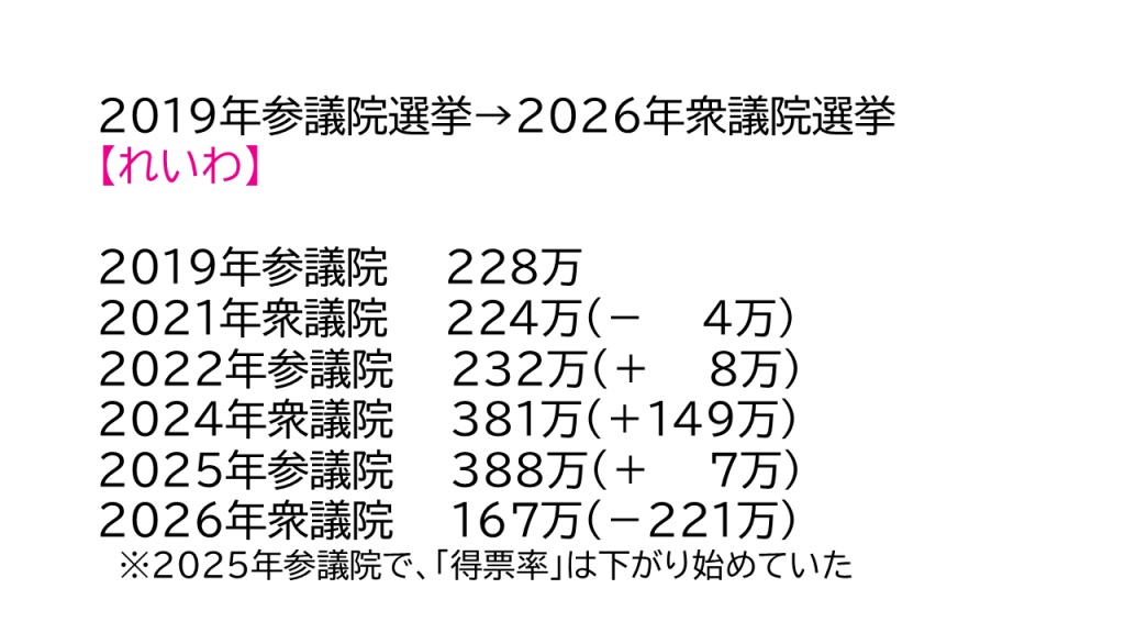 れいわが元々の推移で言うと、7年前に228万票だったのがちょっと減ったりもありましたけども、去年2024年衆議院のときに大きく381万票に増やして、で、去年の参議院選挙も期待通りではなかったという方が多いものの少し増やしてという状況の中で、この衆議院選挙で221万、半分以上、6割くらい減っているっていうことがなぜなんだと。