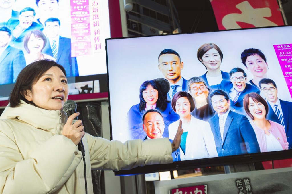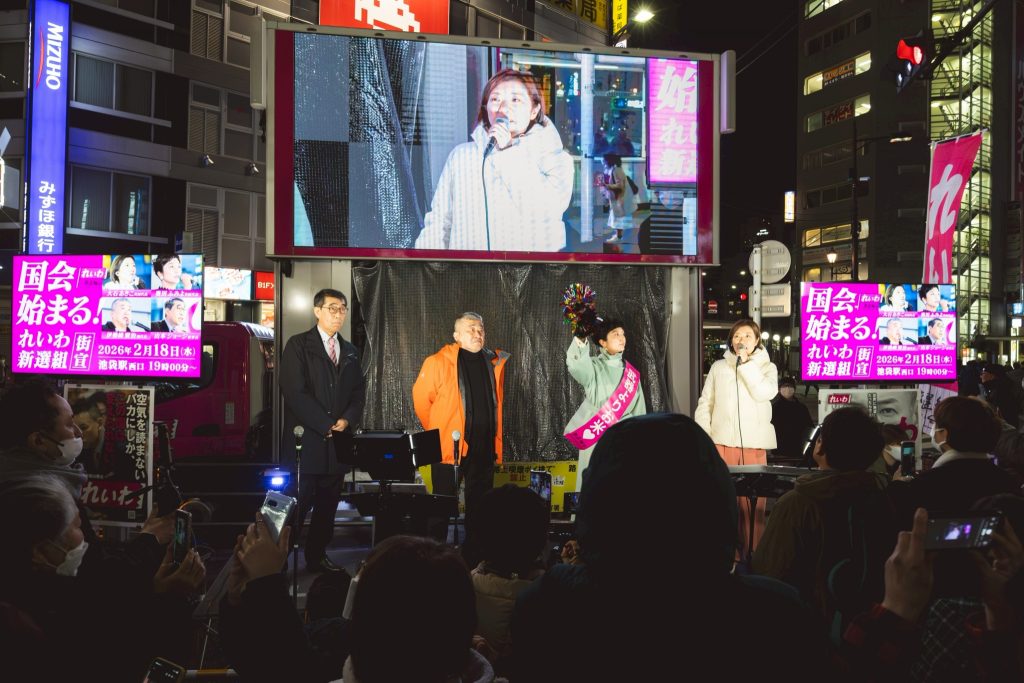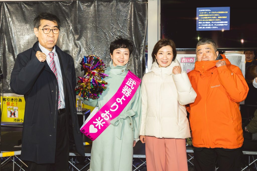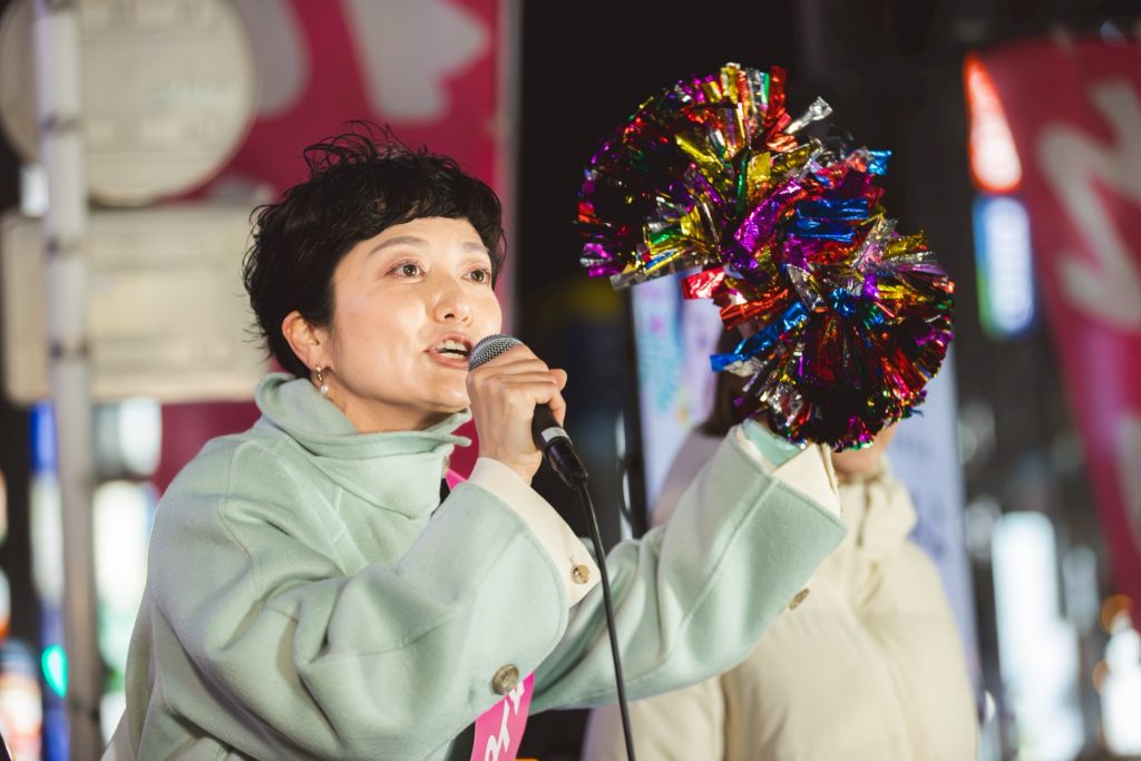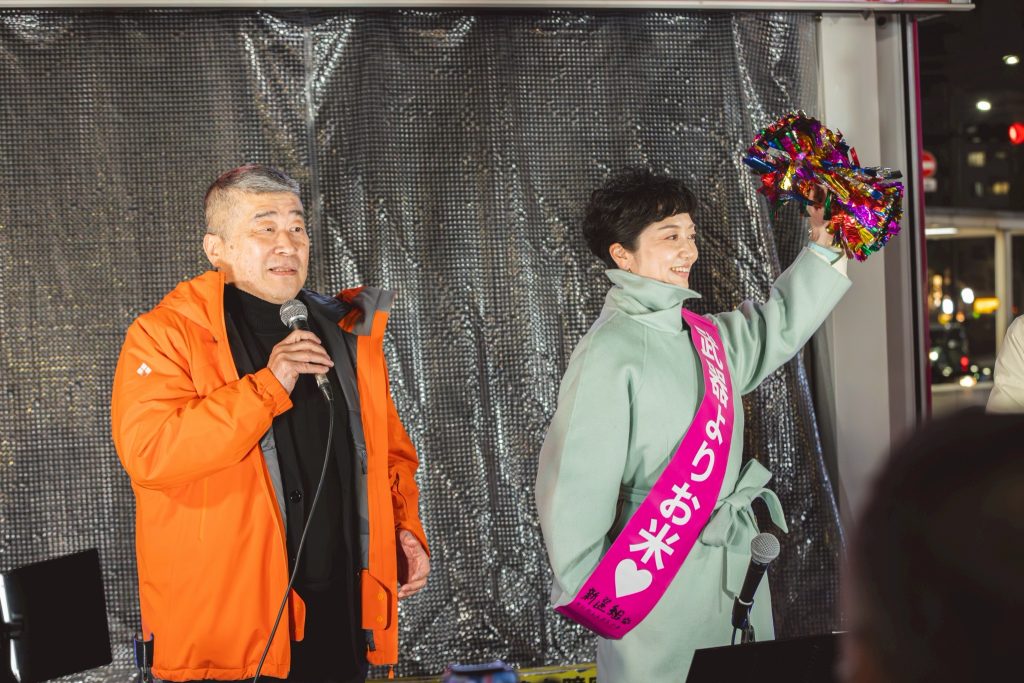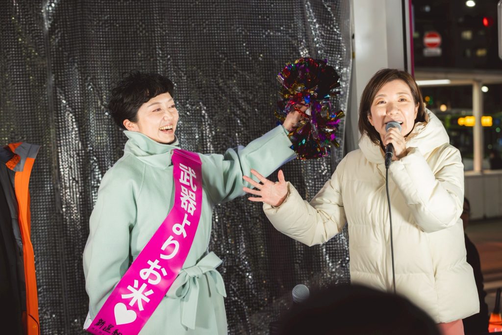 山本太郎が2019年にれいわ新選組をつくりました。消費税廃止と訴えて、どの国会の政党も相手しなかった。だけど山本太郎は他でもない、ここを通ってるあなたに打って出たんですよ。聞いてくれって。消費税廃止できるよ。できないと思ってんの? できますよ。国には通貨発行権があるんだから。そしてここを通ってるあなたが主人公なんだから、主権者なんだから。だからあなたがちゃんと政権、政治を、グリップを握れば消費税廃止なんかすぐできるよ。私たちの手元に通貨発行権取り戻そうよって。30年の不況、それをみんなで脱していこうよと、山本太郎がたった1人で2019年から呼びかけ続けたんです。それで世論が広がったんですよ。だったらいいやんって、だったらいいやんってなって、それで山本太郎を無効化するために、他の政党もやりもしないのに減税掲げるようになったんです。そんなの嘘ですよ。そのトップが高市政権ですよ。食品消費税2年間ゼロって言ってるけど、あれ嘘ですよ。これから国民会議というものにかけるという。そこでいい財源が見つかったら減税する。だけど見つからなかったら増税するっていう。それがそれのどこが減税なんですか。それだけじゃないよ。もうこの春からも子育て支援金の社会保険料負担、皆さん、上がってくんだよ。来年の春からは防衛増税で所得税1%上げられるんですよ。その説明しましたか? 自民党政権が、高市政権が。ふわっとした人気にあやかって、高市早苗が選ばれたから何でもできるって。今、そういう意気揚々としてますよ。だから皆さんに気付いていただきたい。それじゃダメだと。やっぱり世論が、あなたの声が国会の中も揺らすんですよ。いくら高市政権が多数になったとしても、違うんですよ、本質は。主権者はあなただから。皆さんだから。揺らせるんですよ、国会の外からも。だから私は諦めません。れいわ新選組の共同代表大石あきこです。今回の選挙では現有議席を大きく失い、そして私も落選しました。だけど諦められないでしょう。この状況で。山本太郎がここまで変えてきたんですから、世論変えてきたんだから。私の声はスピーカーとしてはまだ小さいですよ。だけど諦めませんよ。すごいやつら入りましたからね。ではすごいやつらからの演説に代わっていきたいと思います。皆さん、これからもよろしくお願いします。れいわ新選組共同代表大石あきこです。