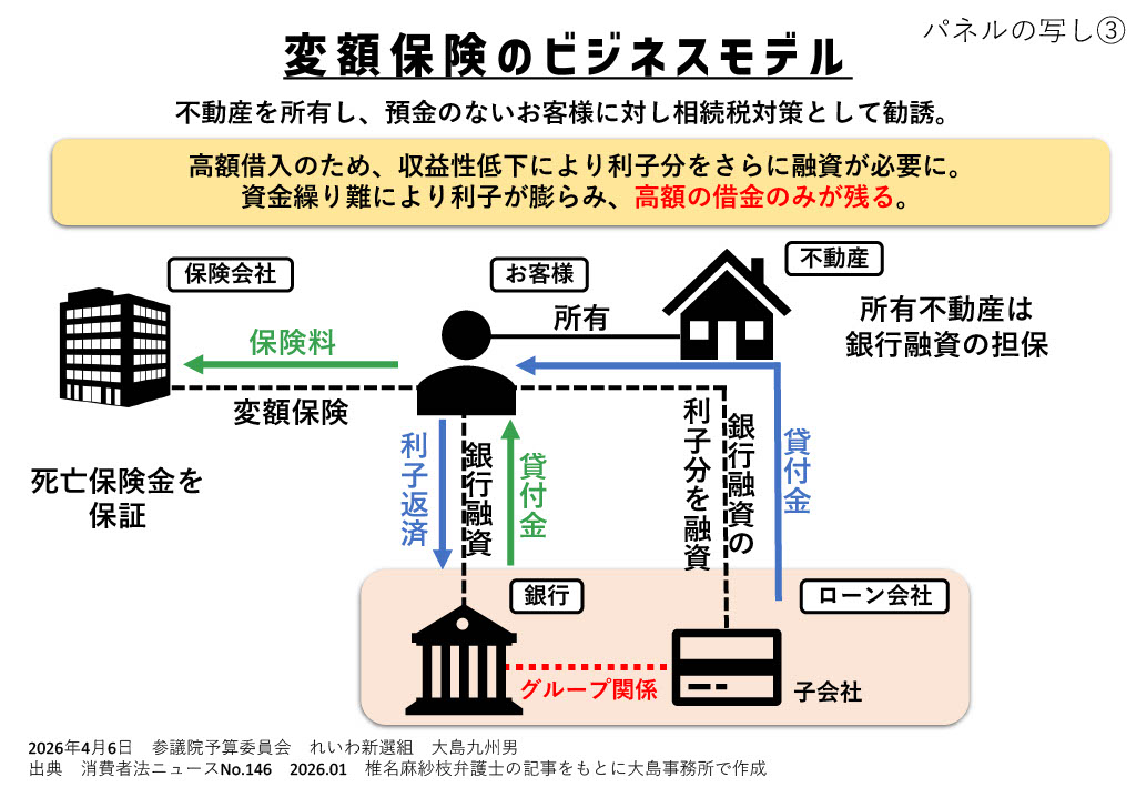 これ、変額保険って、これ30年前に三菱銀行が、結局、不動産は持っているけどお金は持ってないと。で、子どもたちに相続税がかかったりするのは大変だというので、その相続税の軽減だというような、親のそういう思いをうまく利用してビジネスモデルをつくっていると。結果として、その一時金でぼんとお金を借り入れて保険料を払う。で、その利息がもう1億とか2億とかいう保険料で、莫大なその利息を払うような、それが払えないというようなことになると、その三菱銀行が保証会社や自分のカードローン、そういったところに契約をさせて、そしてまたそのお金を払う。で、30年経った今、そういう被害を被っているような人たちの担保を取っている家を、これをもう競売にかけるというような話になっているわけですね。で、その被害者の皆さんが国連のビジネスと人権作業部会とかそういうところに被害を申し立てようとしていると。