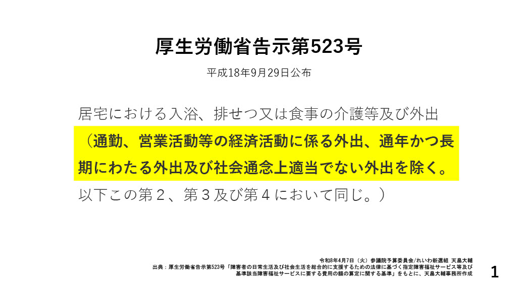 厚労省告示523号により、重度障がい者は、就労だけでなく修学など、社会参加の様々な場面で重度訪問介護は利用できません。これは重度障がい者の社会参加を支える介護保障の在り方そのものが問われている課題です。