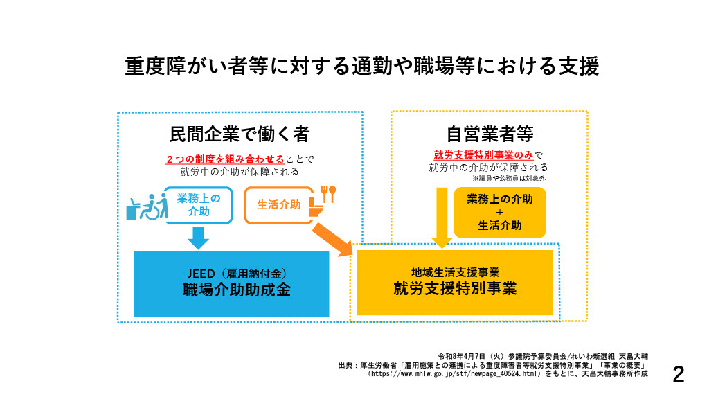 一方、就労支援特別事業は、市町村の予算事業として、通勤時や職場における介助を行うことで重度障がい者の就労を支援して促すものでございます。その自己負担は市町村が判断するものとなっております。