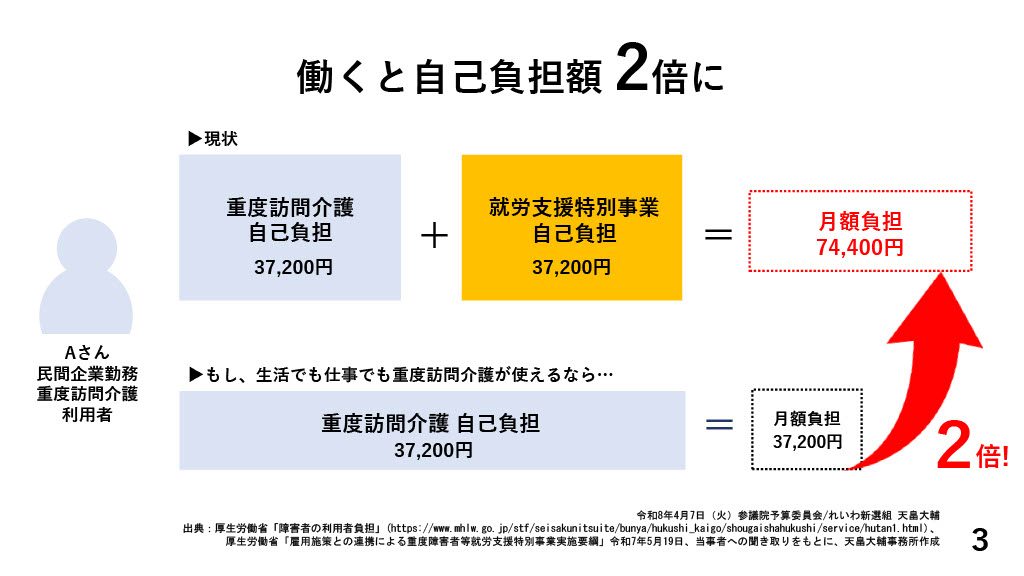 重度訪問介護は、本人の収入額によっては、月に9,300円または3万7,200円の自己負担が生じます。働く前と後で、支援の中身も量も変わりません。例えば、私が働いていても働いていなくても、生命維持のためにヘルパーは24時間必要です。変わったのは、その時間が仕事中かどうかだけです。しかし、働き始めた途端、重度訪問介護と就労支援特別事業の2つの制度を併用することになります。すると、何が起きるか。2つの制度両方で自己負担が発生する。結果として、自己負担額が2倍になる。障害福祉サービスの自己負担額が月額3万7,200円の場合、月に7万4,400円の負担が生じます。就労中も重度訪問介護を使えれば、自己負担額は3万7,200円で済みます。同じ介助を受けているのに、働くと自己負担額が倍になる。